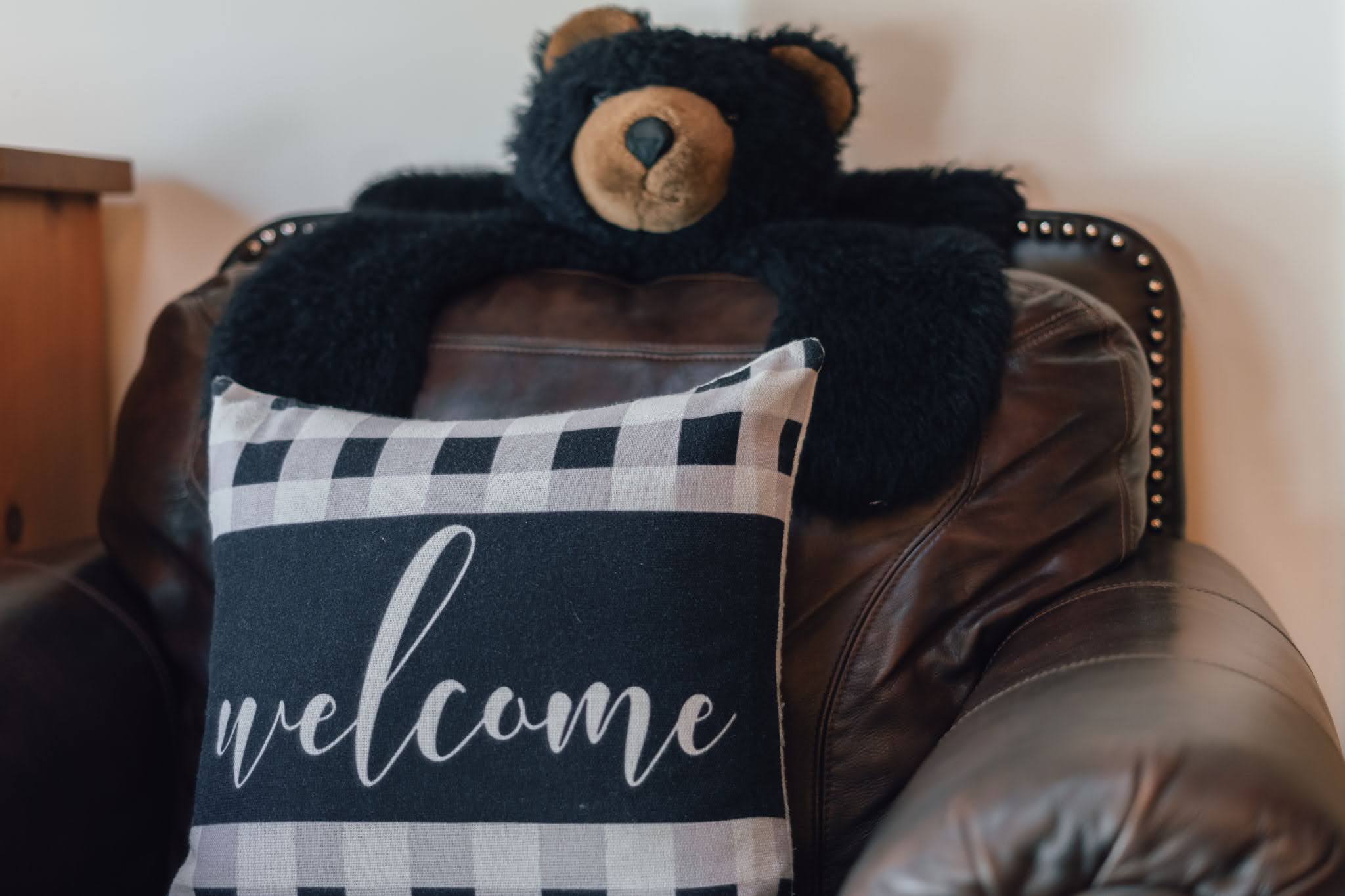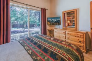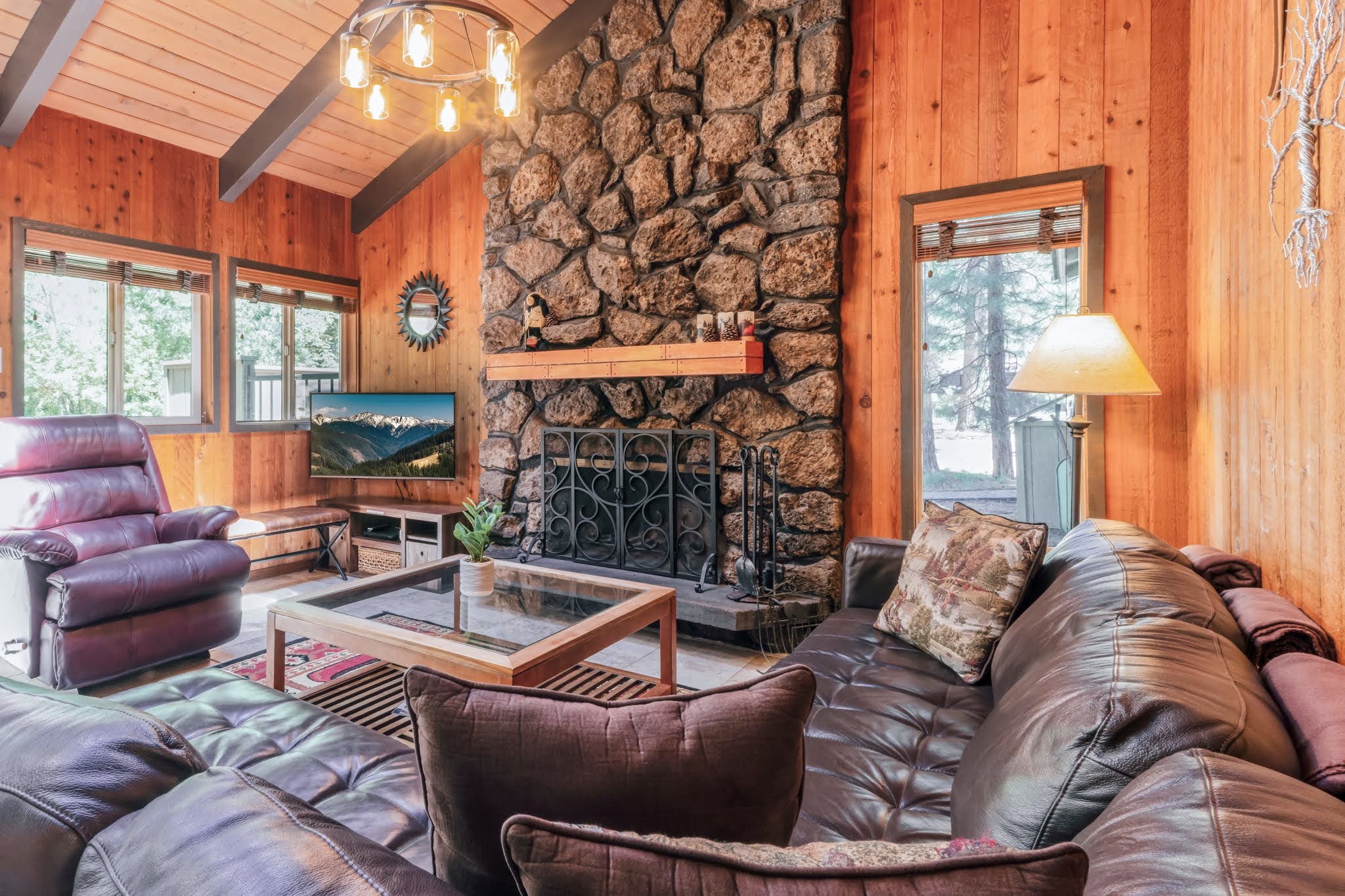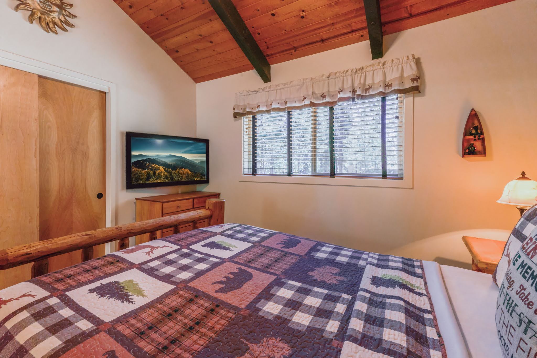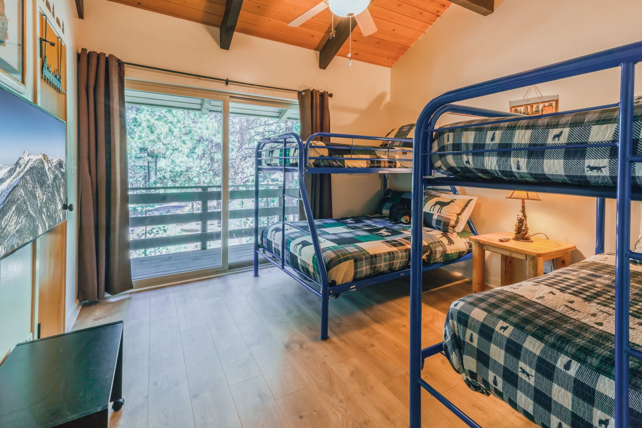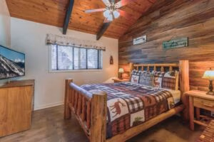 Back inside, get that gorgeous wood-burning fireplace crackling (wood is provided) and snuggle up together in front of the TV while you stream your favorite shows and movies, or play a game of foosball. At bedtime, you've got six comfortable choices: five of the bedrooms are on the main floor; four feature pine-log queen-size beds, and the fifth has a set of pine-log twin beds. The upstairs bedroom has two sets of metal bunk beds, with three singles and one double. Note that upper bunks have a 100-pound weight limit. The upper bedroom has a private bathroom and a balcony.
